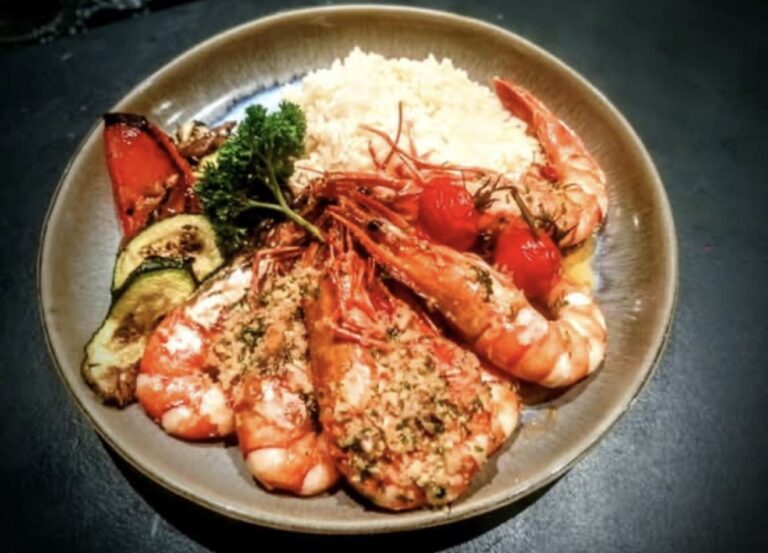 Gambas géantes, frites et beurre à l’ail